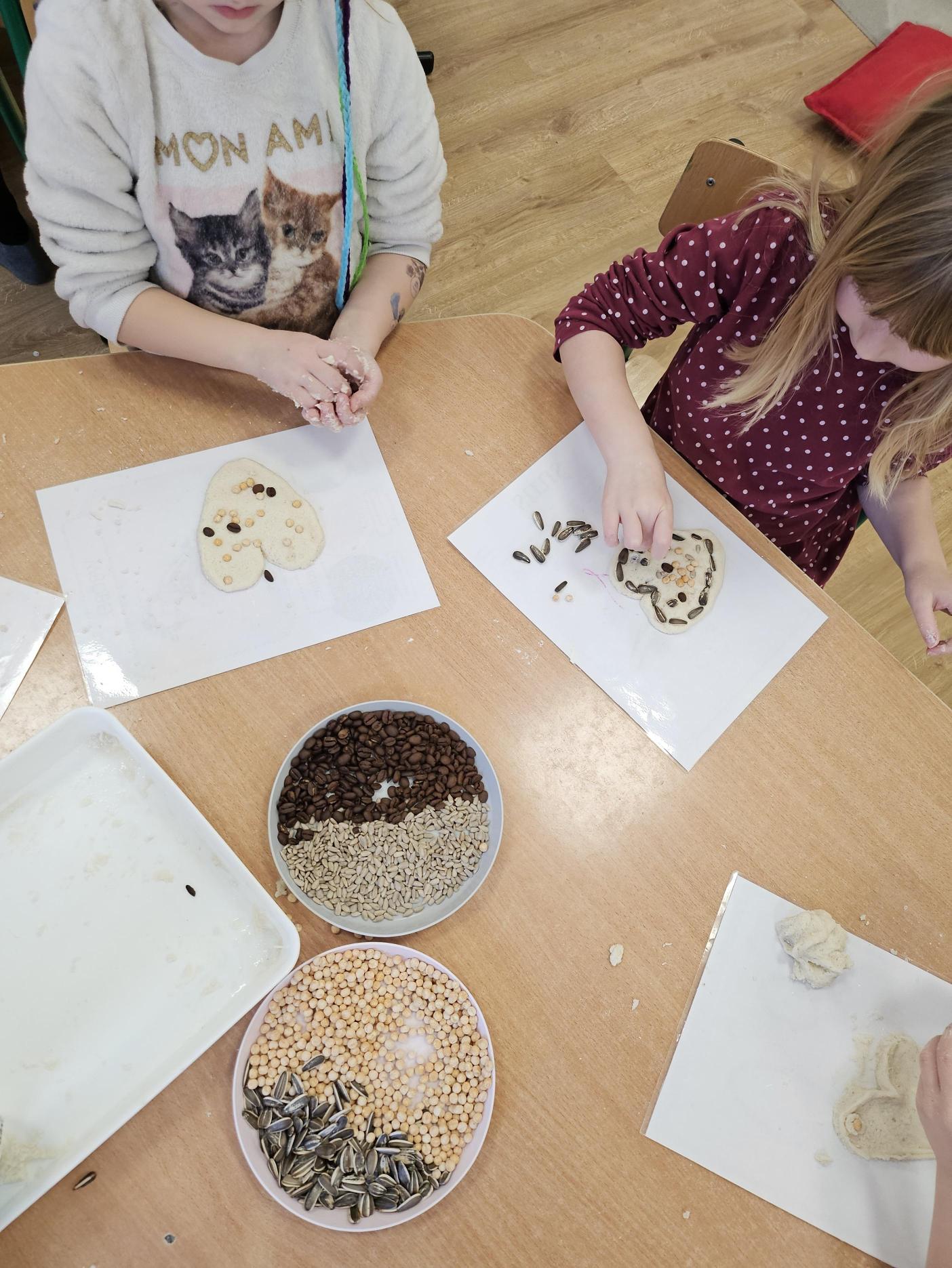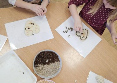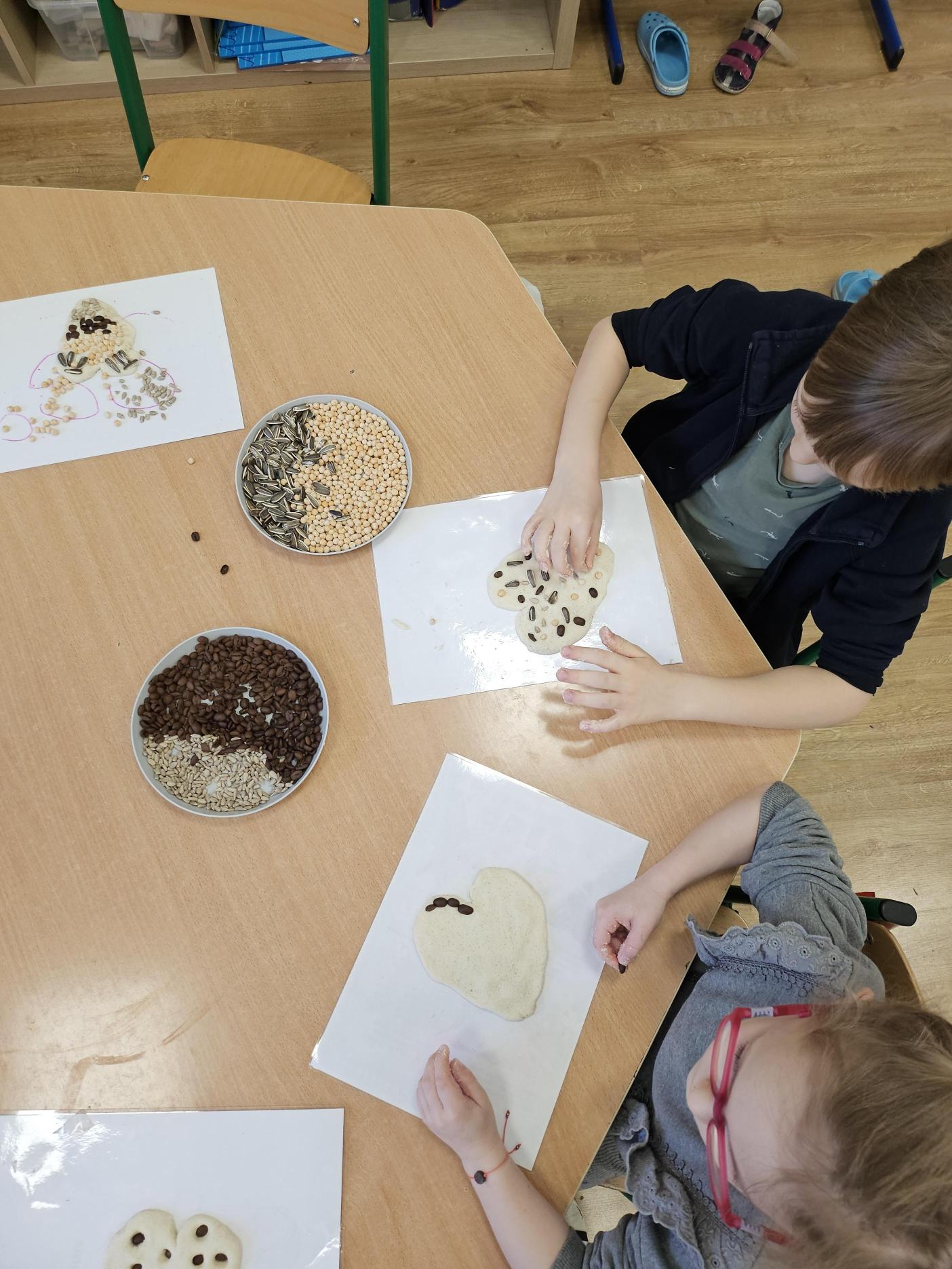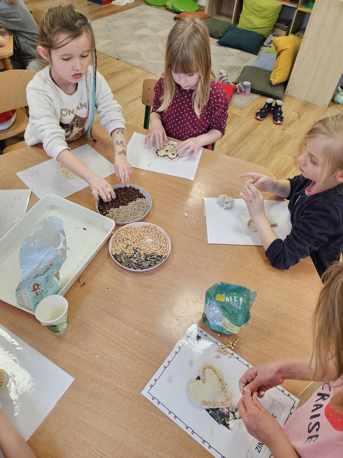 Nasze przedszkolaki dzielnie poznawały nową literkę – tym razem była to litera S! Aby nauka była jeszcze ciekawsza, połączyliśmy ją z kreatywną zabawą sensoryczną. Dzieci dekorowały masę plastyczną przy użyciu nasion słonecznika, ciecierzycy i innych ekologicznych produktów.
